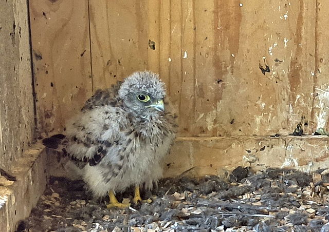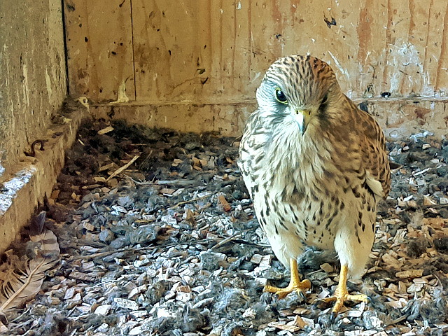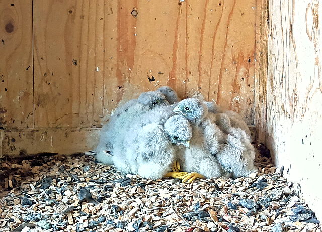 Derzeit werden von Erwin fünf andere, verwaiste Turmfalkenküken von Hand aufgezogen, da kann man hautnah