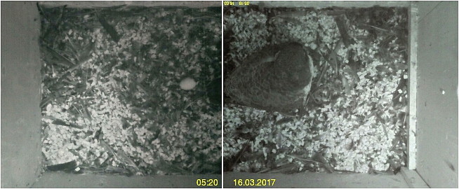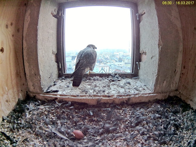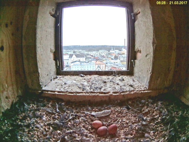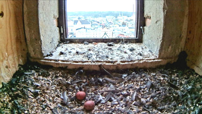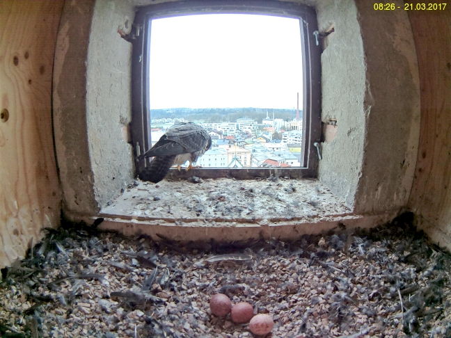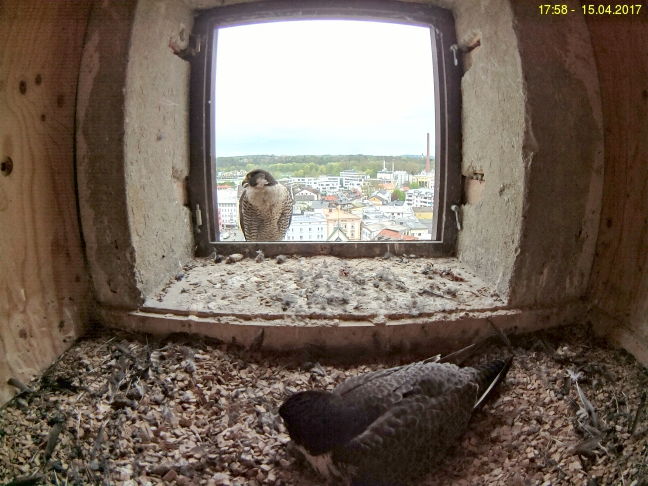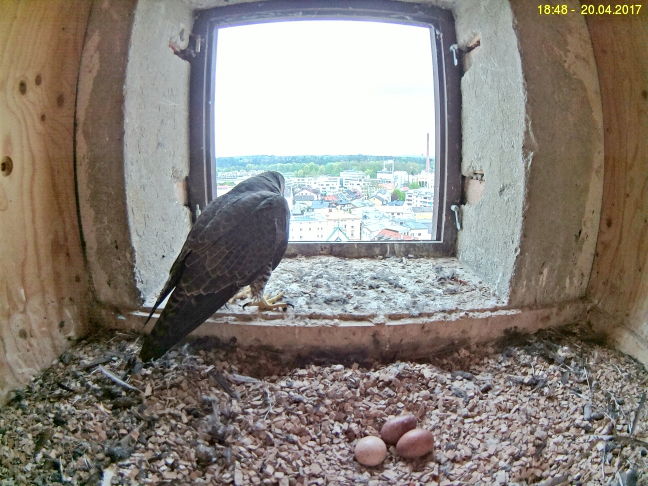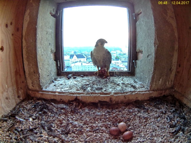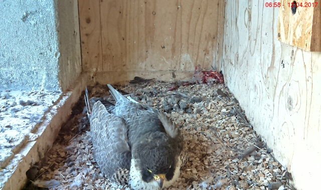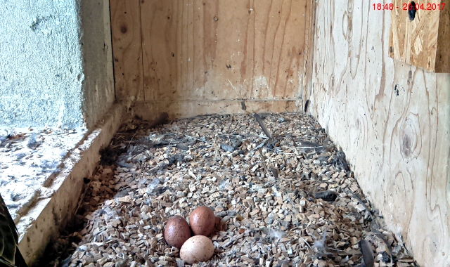 Seither sitzt das Falkenweibchen nun auf den Eiern und wird vom Terzel bis 2 Wochen nach dem Schlupf