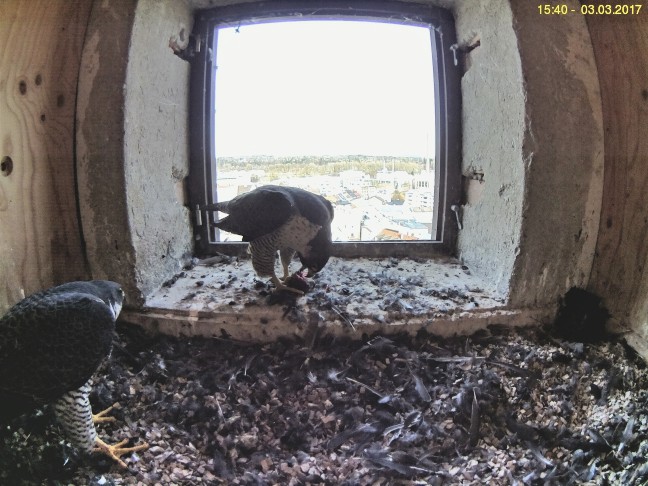 Man kann oft beobachten, dass der Wanderfalke Beute im Kasten deponiert, anders als bei den Turmis