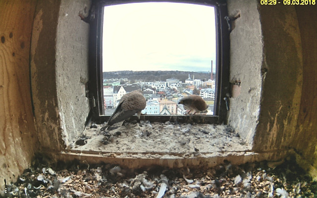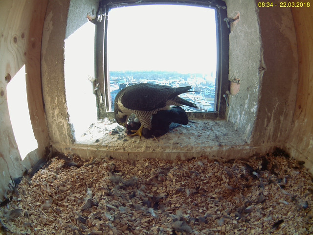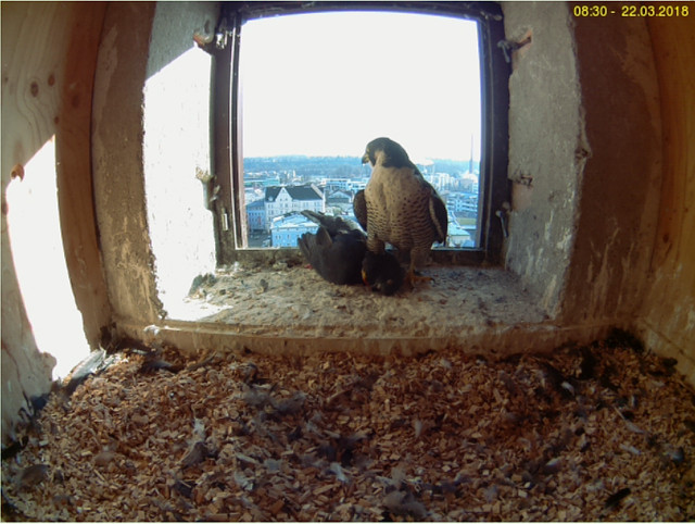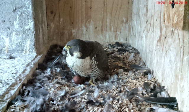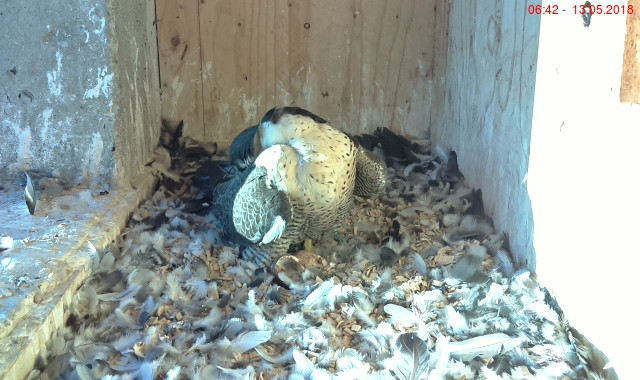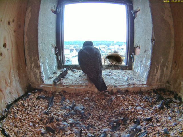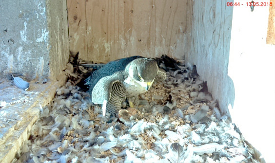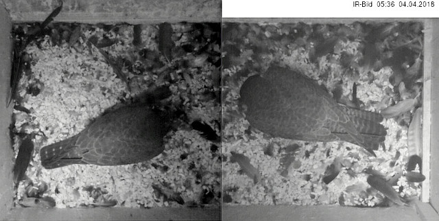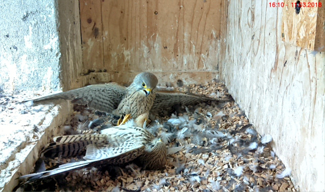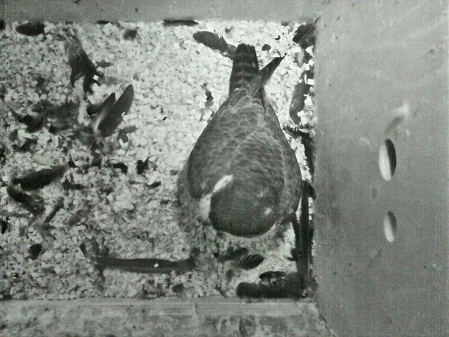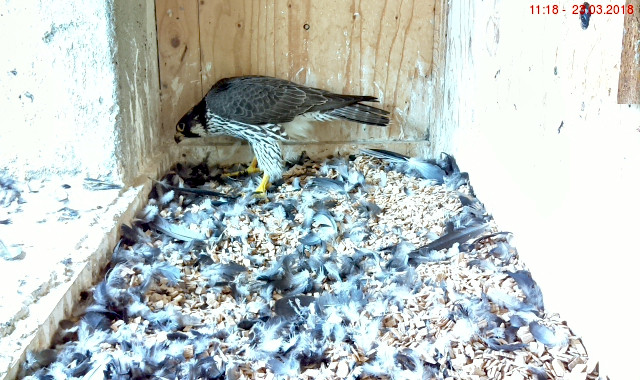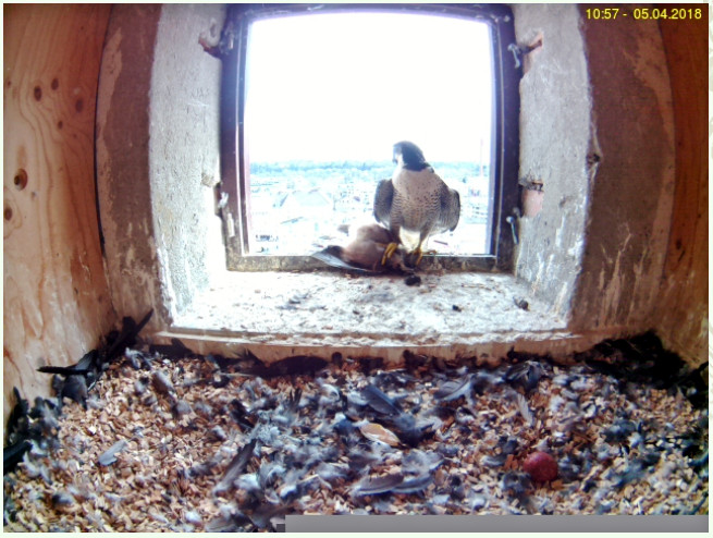 Dann aber wurde Beute im Kasten deponiert, was eher auf die Anwesenheit eines weiblichen Falken schliessen