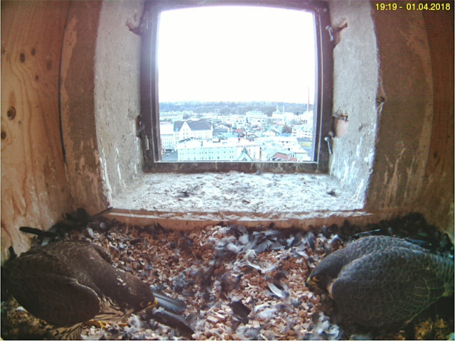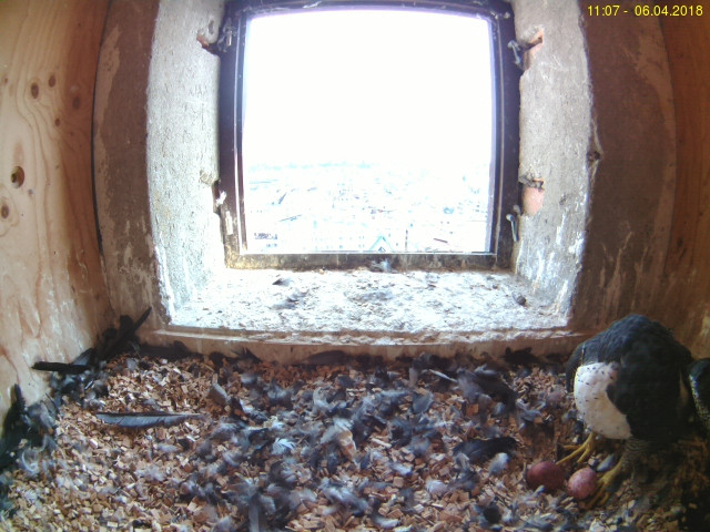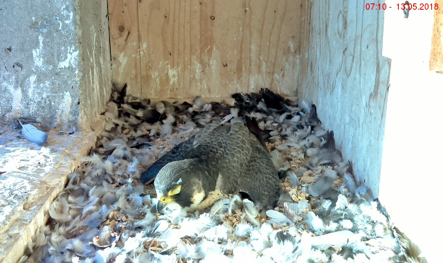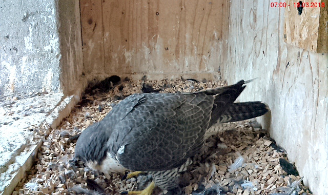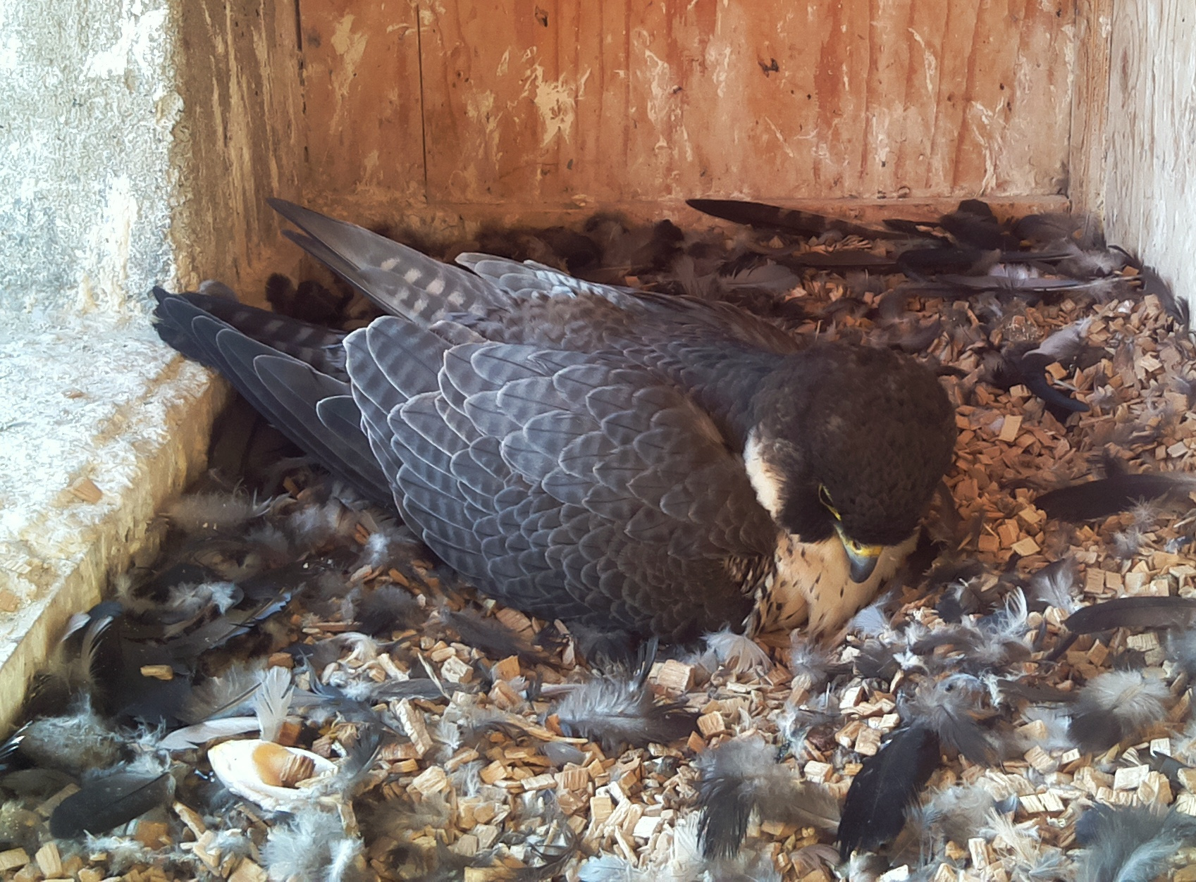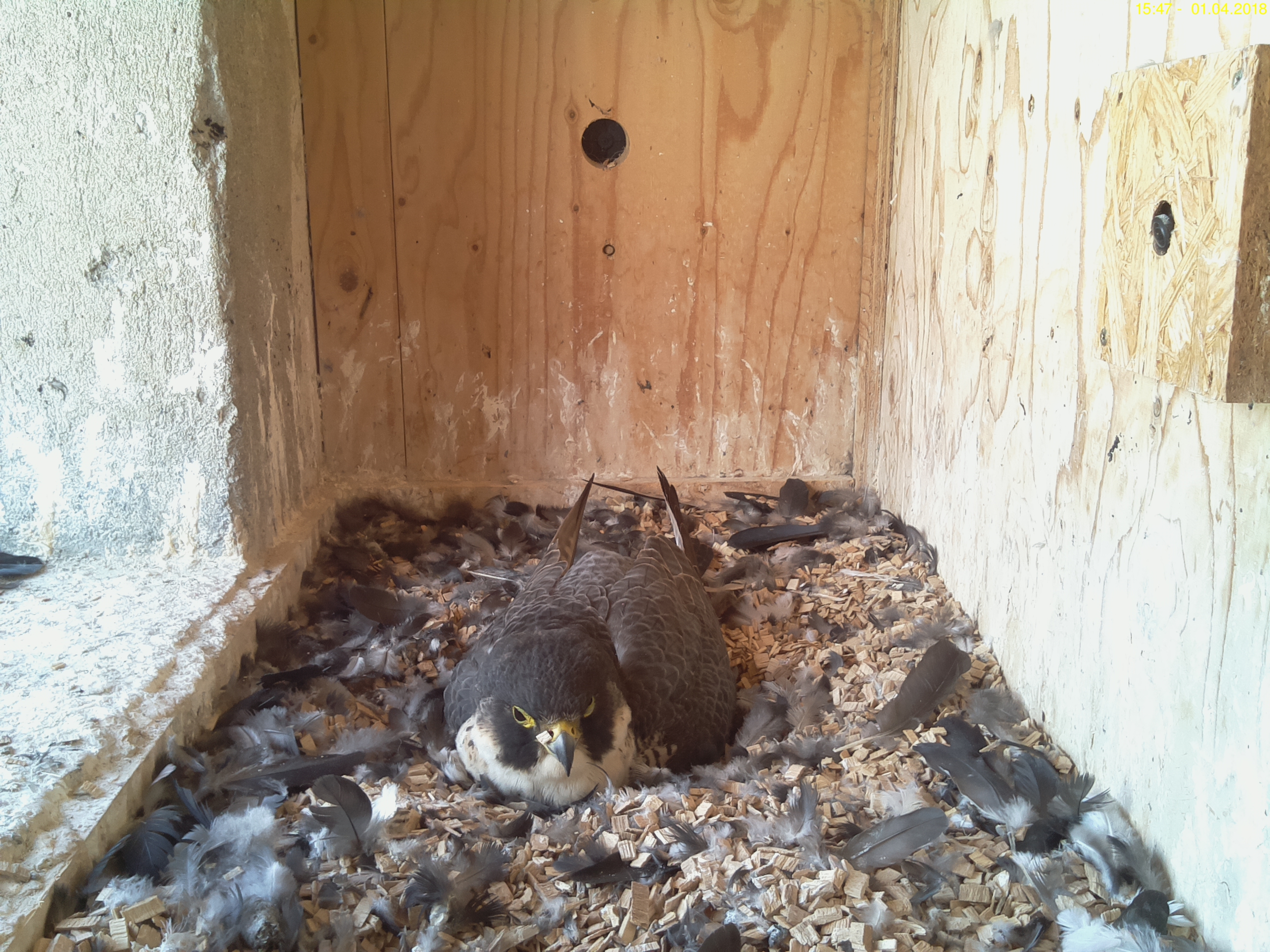Die Falkendame hat dann auf zwei Eiern gebrütet, das Nest war oft lange Zeit unbesetzt. Auch konnte der