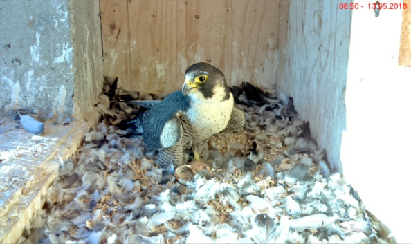 Endlich zeigt sich auch das Wanderfalkenweibchen!