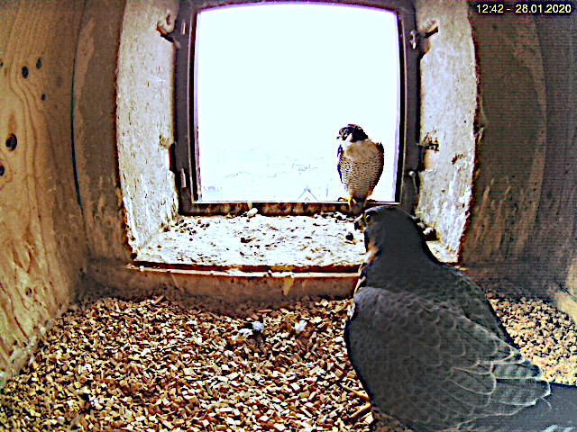 Wieder waren die Wanderfalken den ganzen Winter über oft im Turm, auch in der kalten Jahreszeit
