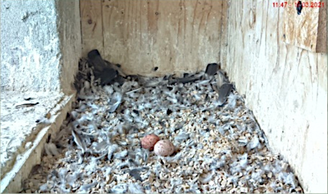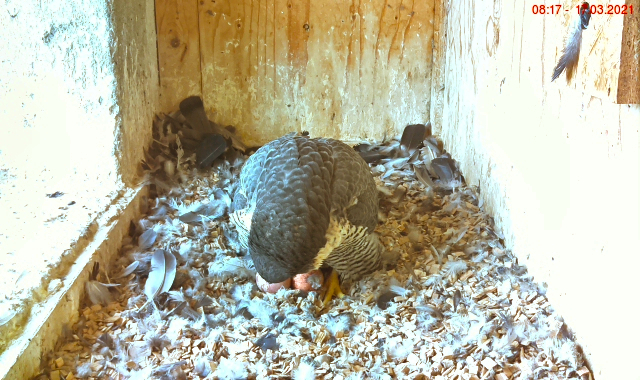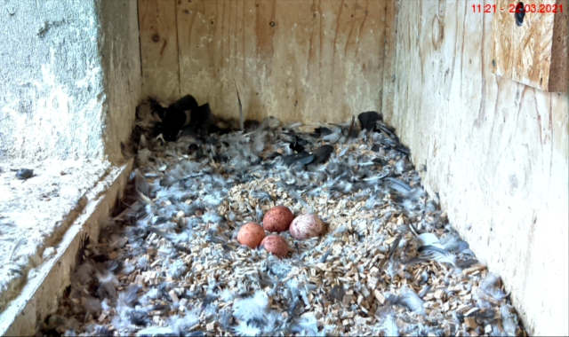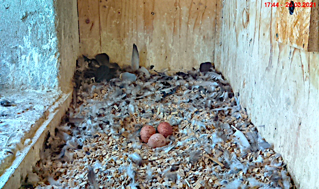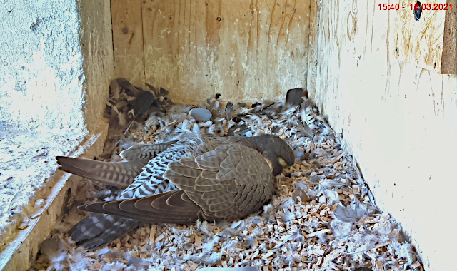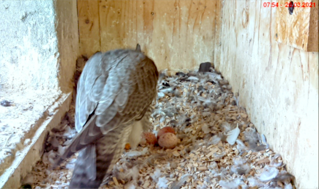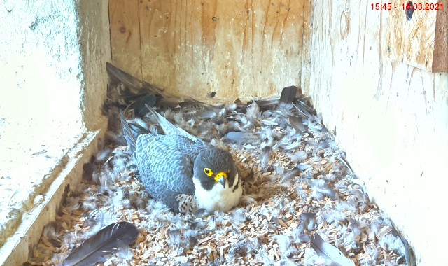 hiermit haben wir mit dem letzten Jahr (damals am 16.03.) gleichgezogen, 4 Eier liegen im Nest.