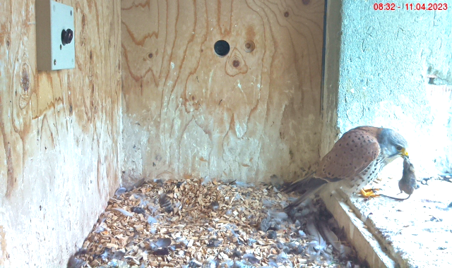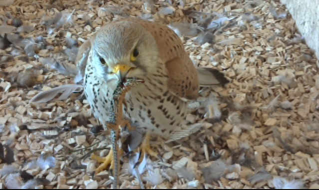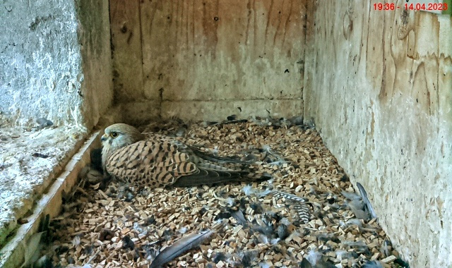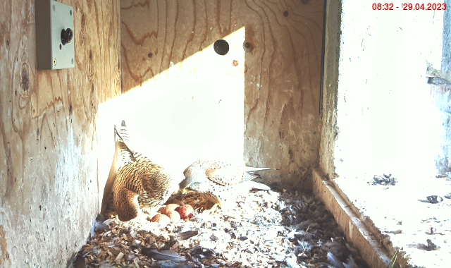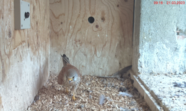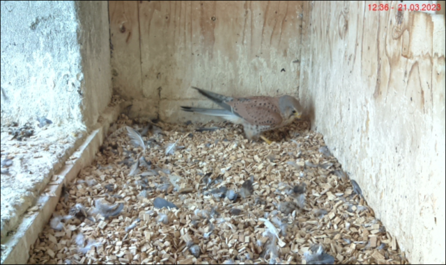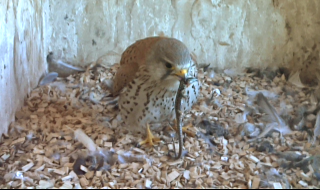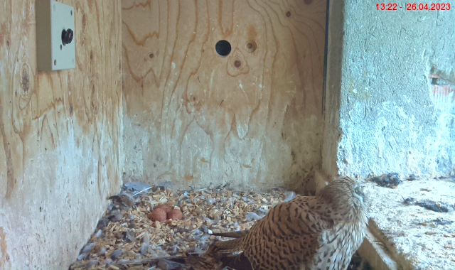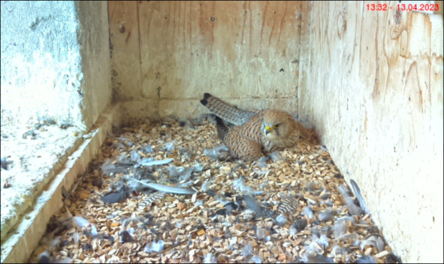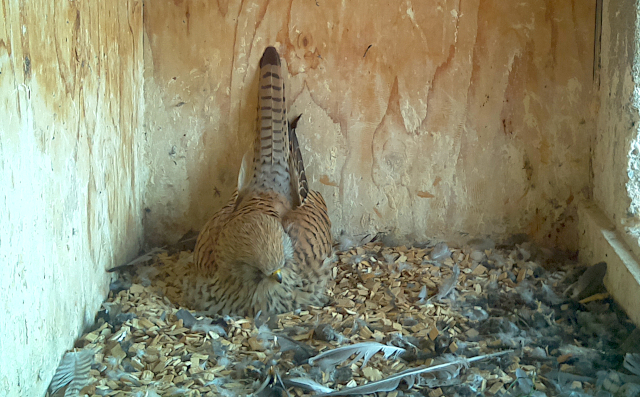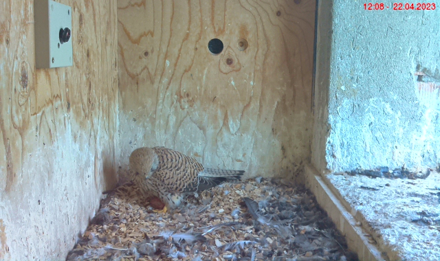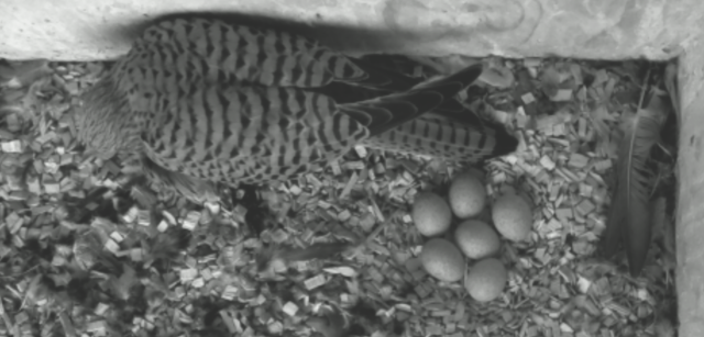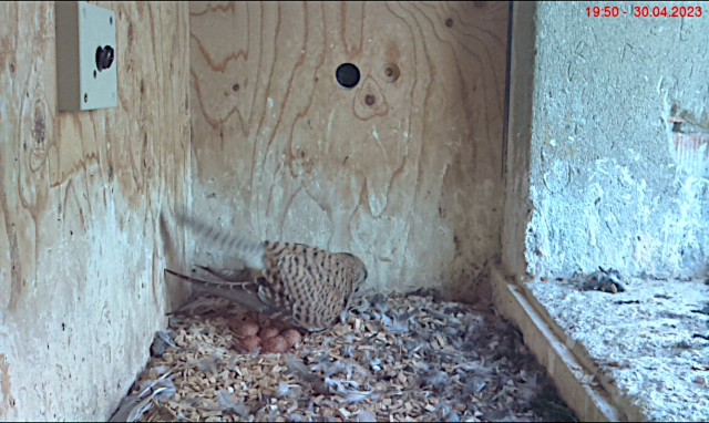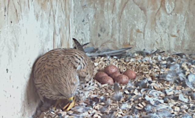 und immer öfter sitzt das Turmfalkenweibchen und wartet auf das erste Ei