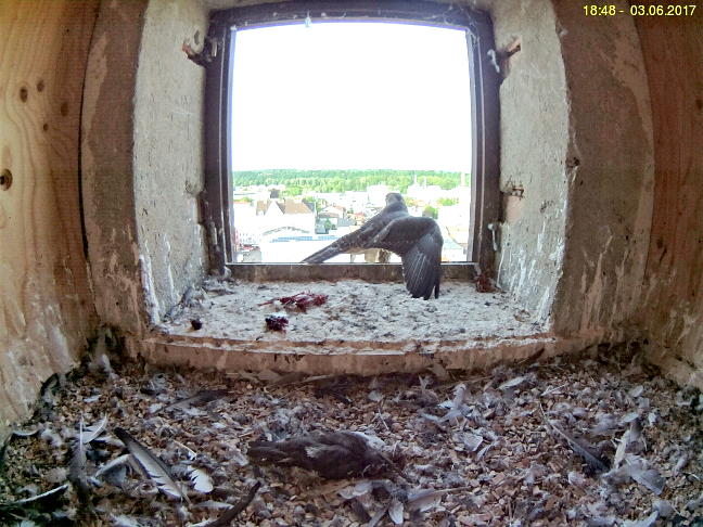 Inzwischen (04.06.) ist auch er auf den umliegenden Hausdächern unterwegs und wird dort von den Alten gefüttert, was man