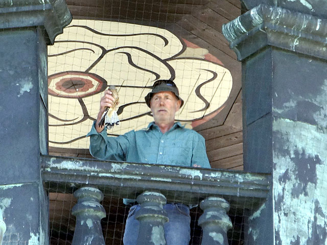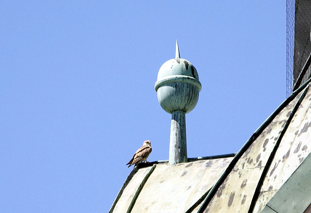 Plötzlich entdeckt Erwin, dass auf der Aussichtsplattform unter der Turmzwiebel ein Falke im dort angebrachten Vogelschutznetz zappelt!.