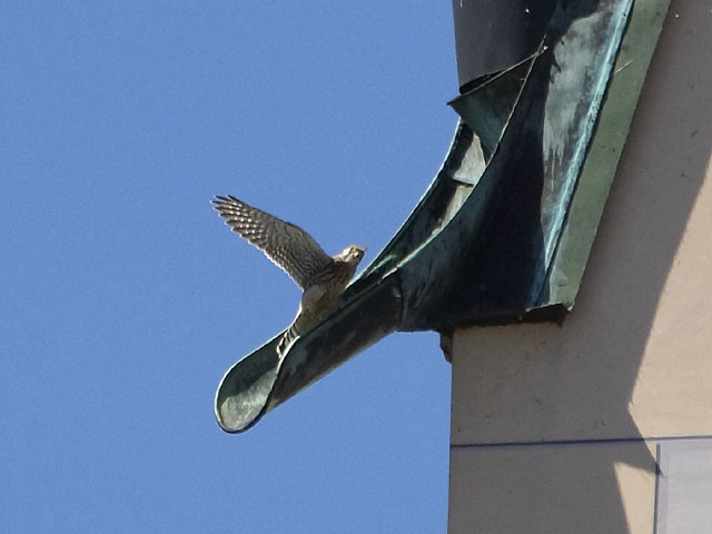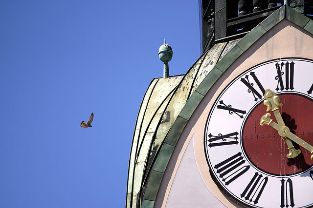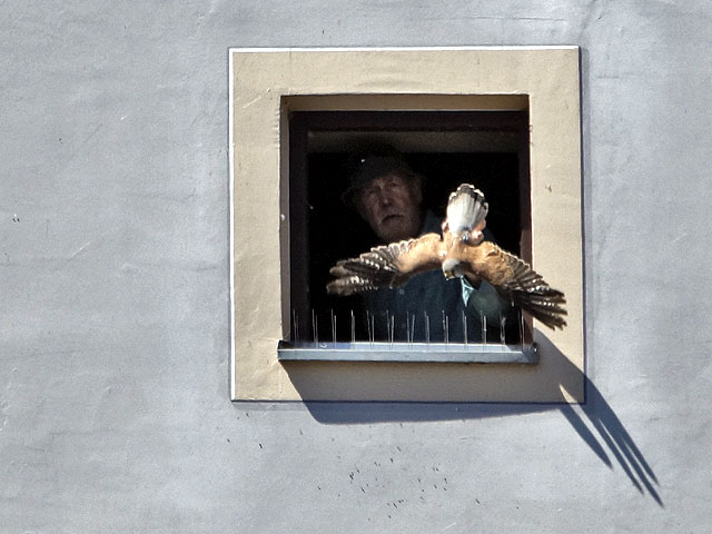 Rasch ist er eingefangen und wird durchs Turmfenster ein Stockwerk tiefer wieder in die Freiheit entlassen. Glück gehabt!